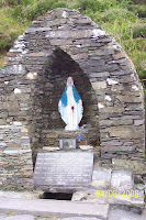 Towards the top, we stopped at a roadside shrine dedicated to the Virgin Mary. “May Our Lady bless you in your going your coming and your staying,” the inscription read, “Till you meet with her and Jesus, where you never more will part.” The Ordnance Survey map that we bought later told us that the grotto was the location of a “Holy Well” with an associated “cross slab”.