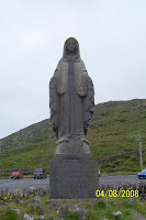 Skirting the east shore of Ballinskelligs Bay, we climbed the northwest flank of Farraniaragh Mountain and came to the Beenarourke Pass, at the crest of the ridge that joins Farraniaragh Mountain on the east with Knockstooka to the west. Here a powerful statue of Our Lady marks the entrance to a large car park which straddles the ridge. Knowing a scenic viewing-point when we see one, we pulled in and parked, and indeed there were magnificent views to north and south.