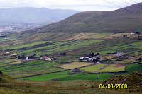 east of Glenbeigh. We passed through the town (where the tragic couple Diarmuid and Grainne hid in a cave), drove a few miles more, and suddenly, as we rounded a bend, Dingle Bay opened up before us. We stopped awhile at a viewpoint, with the steep cliffs of Drung Hill behind us and a view over the purple heather, north to the Dingle Peninsula, and north-east to the amazing sandbars—White Sand stretching north from the Iveragh Peninsula, and Inch Strand stretching south from the Dingle—which protect Castlemaine Harbour and its vital wetlands. (Here could be heard the fourth Ominous Wave of Ireland, the Tonn Toime, whose moaning once portended great disaster, and later lamented the disappearance of Ireland’s ancient nobility.)